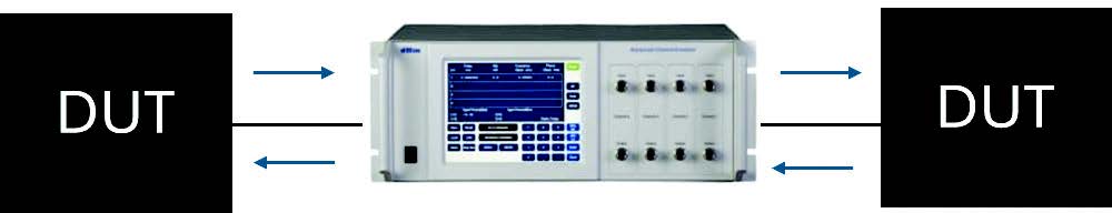 執行端對端 SATCOM 鏈路測試最直接的方法,是在通訊的兩端 (DUTs) 之間插入一台 Maury Microwave (dBm) ACE9600,以建立鏈路損耗,如下圖所示。