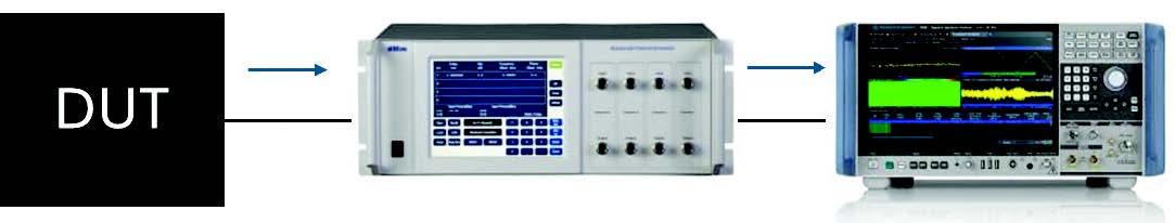 如果測試過程中發現問題,可將其中一端的待測物 (DUT) 替換為 R&S FSW 頻譜分析儀,以進行訊號的故障排除,如下圖所示。
