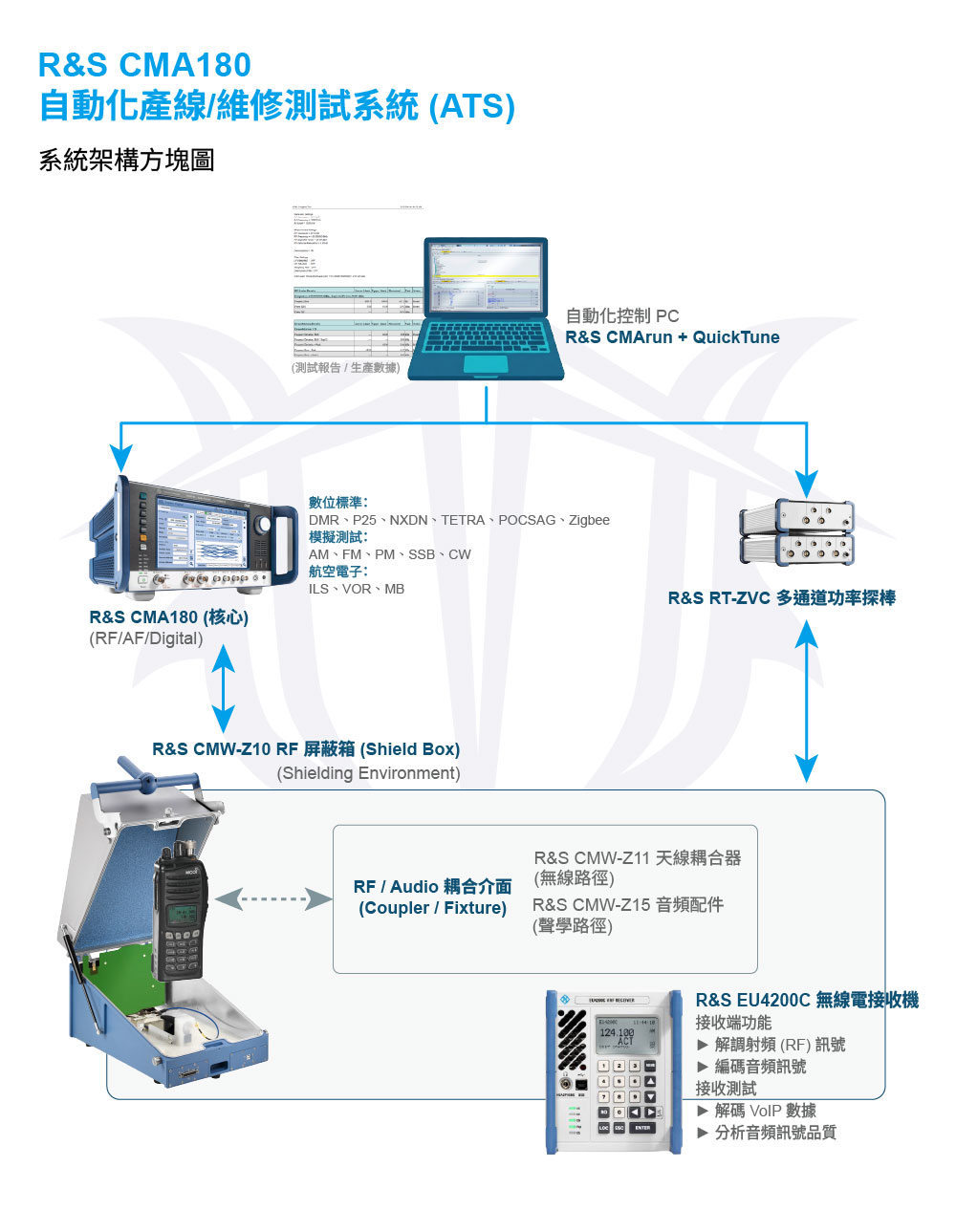 此方案是以 R&S CMA180 無線電綜合測試儀 為核心,整合 RF 屏蔽環境 與 精密電源分析 的一站式系統,它不只是一台儀器,而是一套完整的生產履歷與品質守門員;透過高度整合的硬體架構,我們將原本需要三台儀器(頻譜儀、訊號產生器、功率計)的功能濃縮於一機,並搭配 R&S CMArun 自動化軟體,實現從「掃描條碼」到「列印報告」的全程自動化作業。