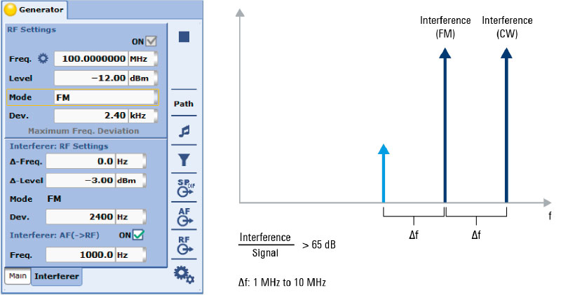 內建干擾產生器可進行同頻道與鄰頻道抑制測試,無需額外訊號產生器