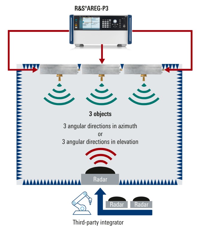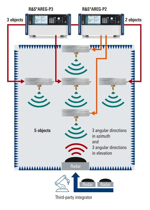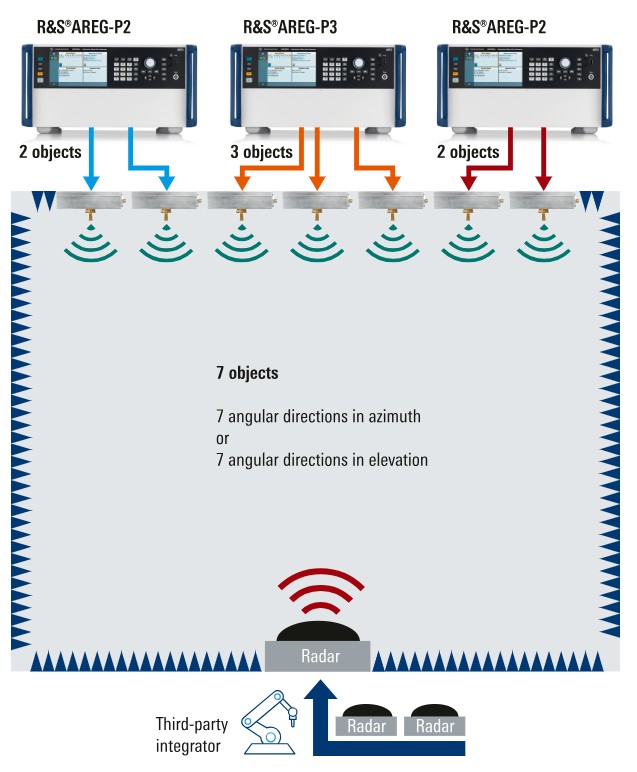 此為最先進的配置(2 × R&S®AREG-P2 加上 1 × R&S®AREG-P3),包含三台主機與七個毫米波遠端前端模組,可覆蓋七個不同角度方向,此解決方案適用於最先進的成像雷達測試。