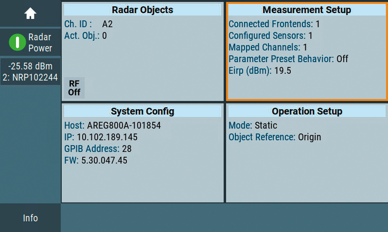 R&S AREG8-81S mmWave 遠端前端連接至一台主機,並將 RF(射頻)雷達訊號(ISM 與 E 頻段)降頻轉換至 AREG800A 的 IF(0.7 GHz 至 5.7 GHz),R&S NRP8SN 功率感測器將 mmWave 遠端前端的 IF 輸出介面連接至 AREG800A 主機,待測物雷達的 EIRP 值將直接顯示在 AREG800A 的圖形化使用者介面上。