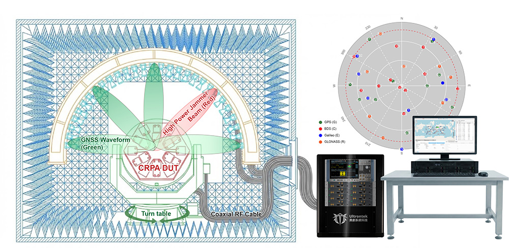 奧創系統提供客製針對 GNSS 可控輻射模式天線 (CRPA) 的完整 GPS | GALILEO | GLONASS | BeiDou 測試方案,我們呈現在實驗室內重現最精簡的真實衛星移動狀況 (OTA),確保您的系統在強干擾下仍能精準定位。