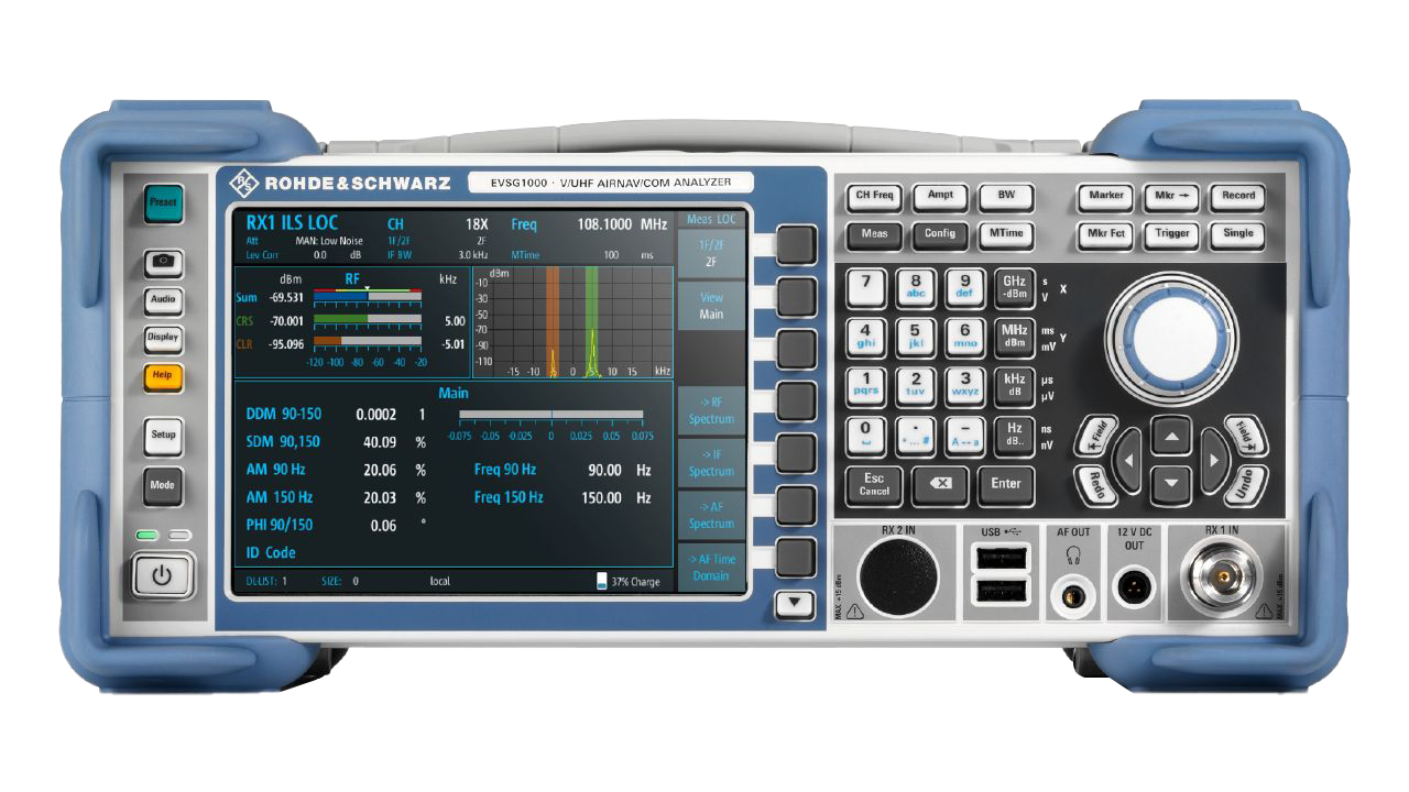 R&S EVSG1000 是現場量測航道 (CRS) 與淨空 (CLR) 訊號的主要工具,透過選配的 R&S EVSG-K1,可對雙頻 (2F) ILS 系統進行同步分析。 - 實驗室/維修站分析: