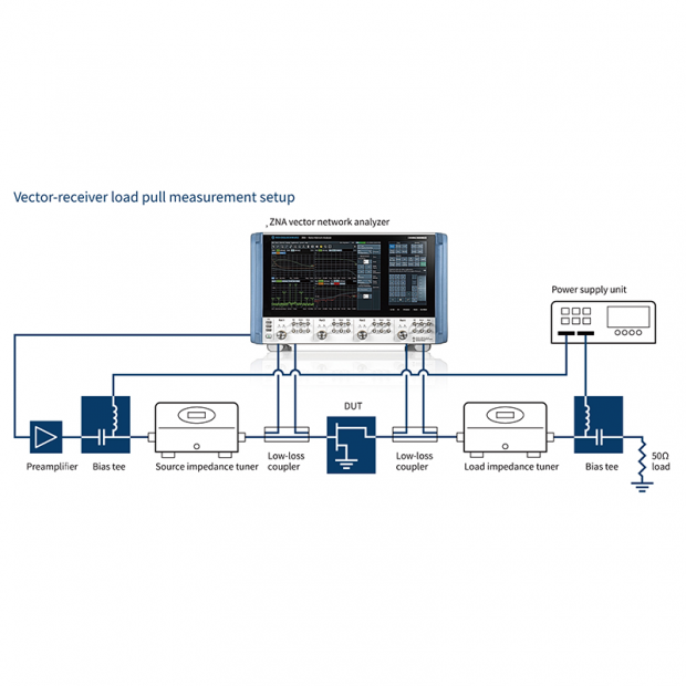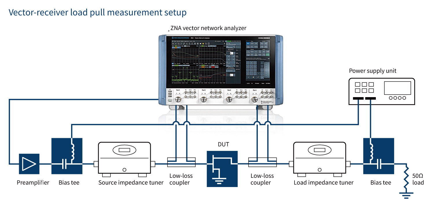 現今的負載牽引量測配置通常包含R&S®ZNA 向量網路分析儀(VNA),以及搭配源極與負載阻抗調諧器,透過 VNA 的直接接收機存取(Direct receiver access) 功能,並藉由外接的低損耗耦合器,便能精確量測進出待測物的 a、b 向量波;此外,VNA 也能在待測物參考平面進行校正,確保 a、b 向量波量測的最大穩定性與準確度。