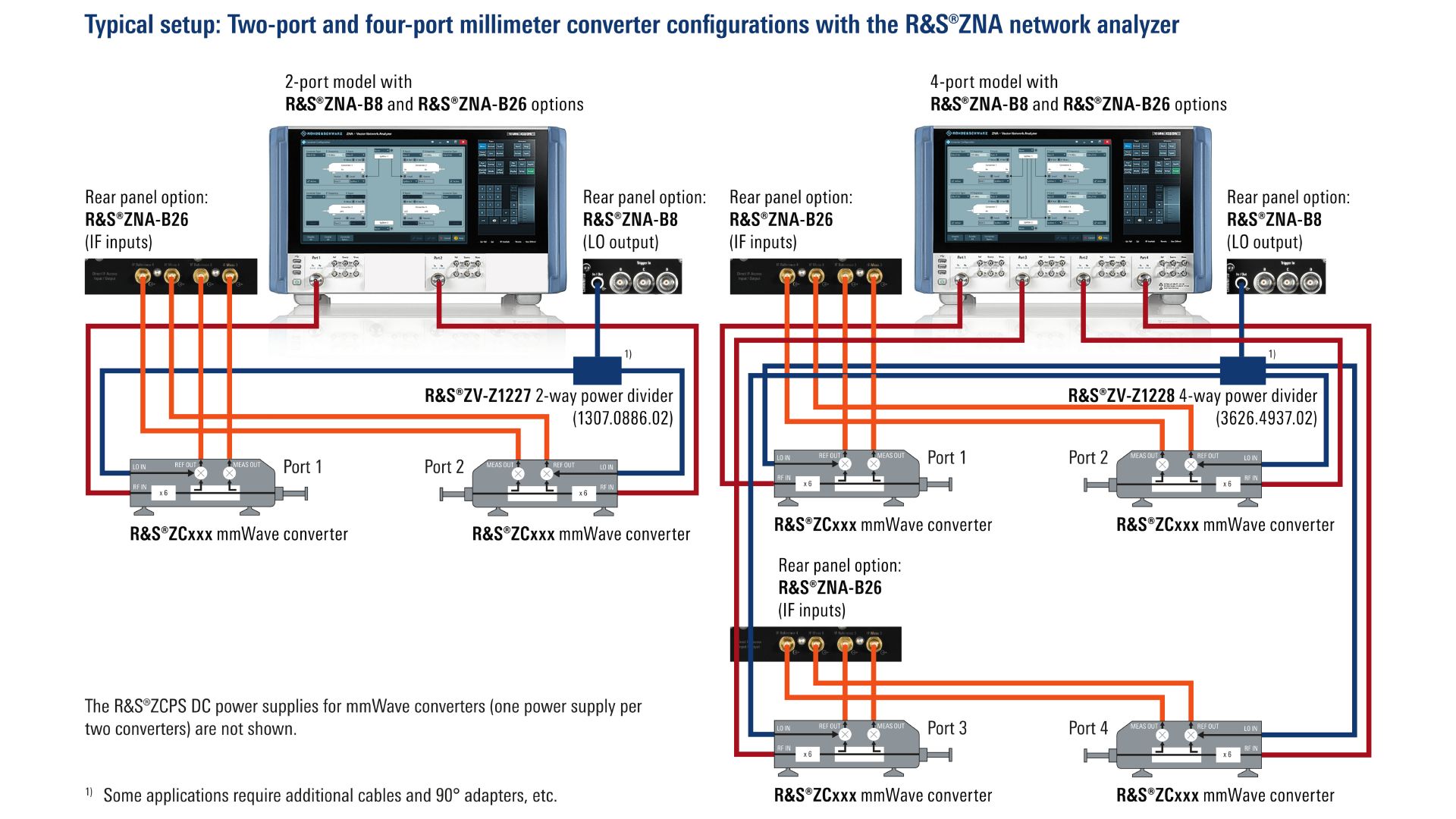 圖 2:此解決方案的典型測試配置,展示 2 埠與 4 埠 mmWave 毫米波轉換器與 R&S®ZNA 的連接方式。