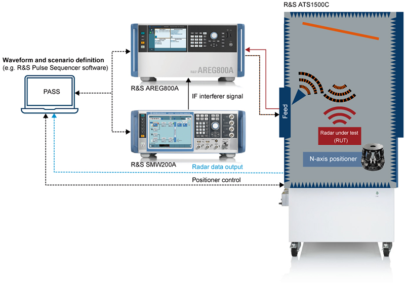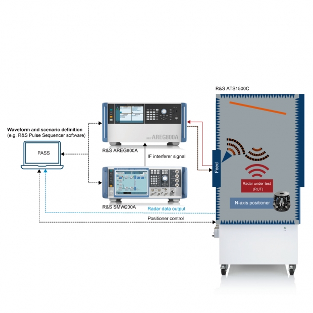 R&S®AREG800A 具備高度彈性,能夠產生多個獨立的動態目標並將干擾訊號注入雷達的視角範圍內,透過提供 IF(Intermediate Frequency,中頻)的輸入介面,R&S®AREG800A 搭配 R&S®SMW200A 向量訊號產生器可模擬多種類型的干擾源,所產生的干擾會疊加在回波訊號上,並透過 R&S®AREG800A 前端升頻至 RF(Radio Frequency,射頻)網域。