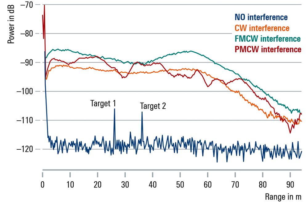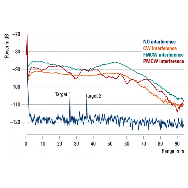圖 2 展示了當不同類型的干擾訊號如 CW(Continuous-Wave,連續波)、FMCW 與 PMCW 存在時,雷達感測器的行為表現,當強烈干擾導致雷達感測器的雜訊位準急遽升高時,車用雷達便無法偵測到目標,此範例說明了雷達感測器穩健性的重要性,以及測試和驗證的必要性。