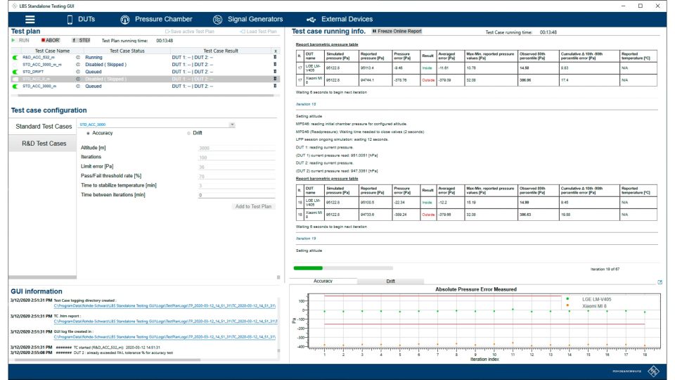 透過組織架構清晰的 GUI 和行動應用程式,測試案例可以輕鬆地執行與參數化設定,GUI 中整合的自動化功能可縮短測試時間,並提供便利的操作體驗,歸功於行動應用程式,量測結果可以輕鬆地透過基地台模擬器回報給 GUI,或直接經由 Wi-Fi 回報至 GUI 的報告系統。