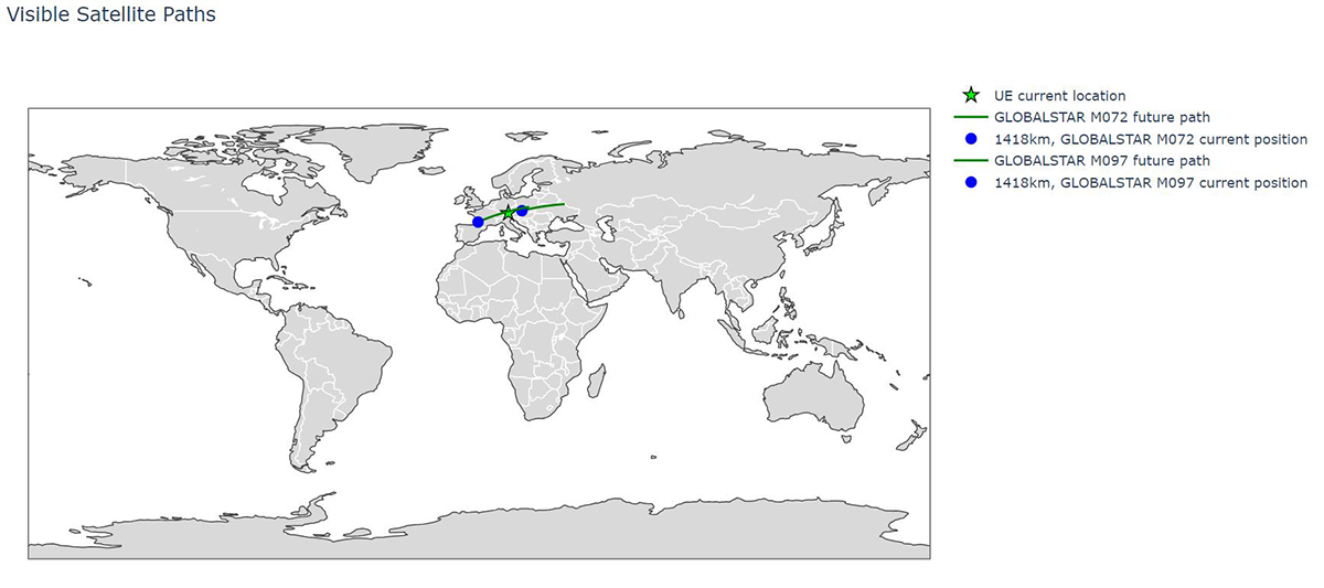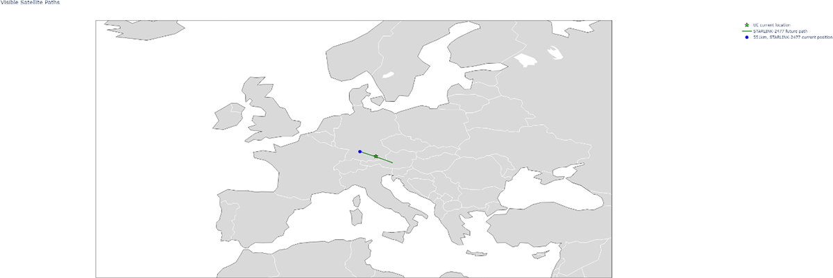 根據您設定的地面使用者設備 (UE) 位置或移動軌跡,精準分析哪些衛星在何時可見,並計算可通訊的持續時間,為通訊鏈路規劃提供關鍵依據。 - 動態軌跡模擬: