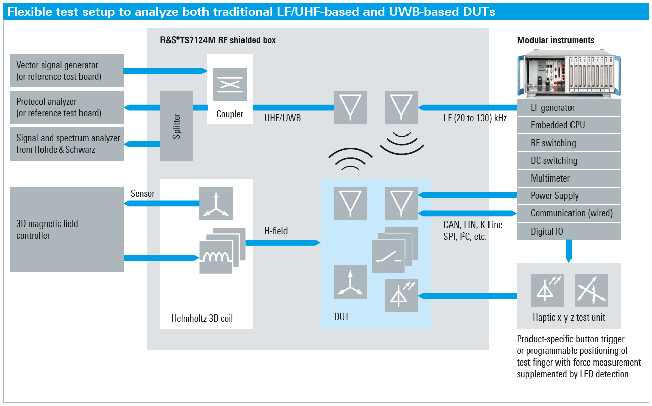 此測試系統由一個 R&S®TSVP PXI(PCI eXtensions for Instrumentation) 平台負責控制,並可選配嵌入式個人電腦,系統能夠量測不同操作模式下的供應電流,並使其與 UWB 訊號的 RF 叢發同步,而與待測物的通訊則可透過 LIN、CAN、I2C 或 SPI 等介面進行;測試人員可使用功能強大的 R&S®Quickstep 測試序列軟體來監控與調整測試條件,測試資料也能被收集起來,以便在測試系統之外進行後續處理;此解決方案採用的模組化設計,使其能輕易適應當前與未來的客戶需求。