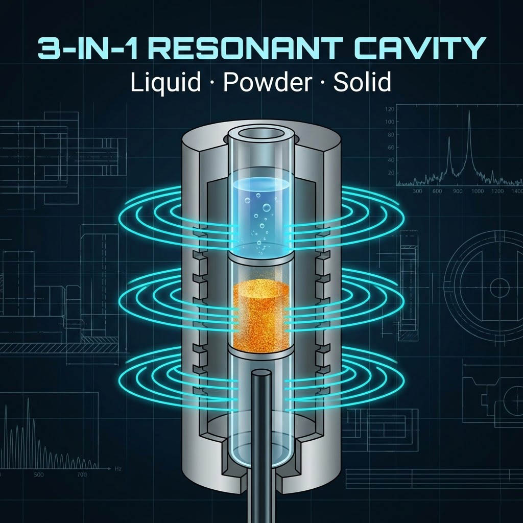 「三合一諧振腔 (3-in-1 Resonant Cavity)」 技術的出現,正是為了打破這些限制,它利用微波共振原理與特殊的容器化設計,在單一架構上實現了液體、粉末與固體的三態共用測試,特別是針對粉末「免固化直接量測」的特性,徹底改變了材料前段研發的驗證流程。