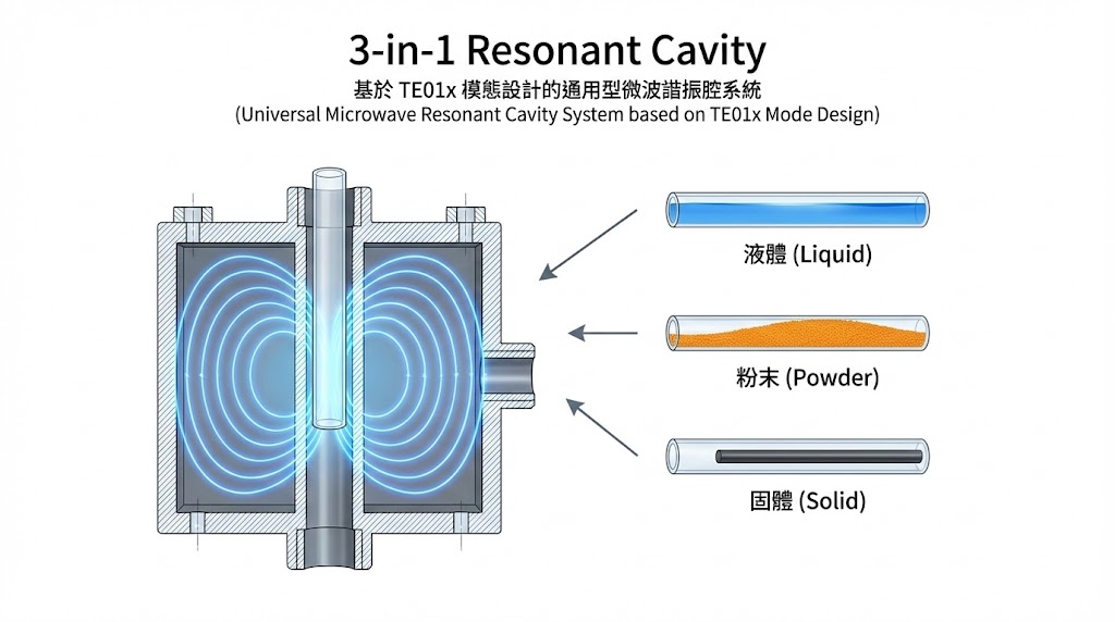 這項技術的核心在於一種基於 TE01x 模態 設計的微波諧振腔系統,與傳統只針對特定形狀樣品(如薄片或圓柱)設計的諧振腔不同,三合一諧振腔的設計理念是「容器化」的通用性。
