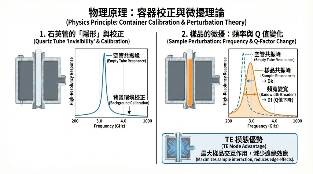 石英(Quartz)本身是一種極低損耗且介電常數穩定的材料,系統會先量測「空石英管」在腔體中的共振特性,將其視為背景環境的一部分進行校正。 - 樣品的微擾: