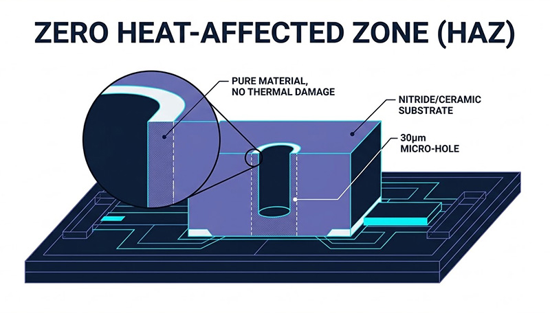 在現代超高密度探針卡的製造中,需要在厚度達一毫米的氮化矽(Silicon Nitride)或精密陶瓷基板上,鑽出直徑僅三十微米、且排列極度密集的微孔(深寬比超過三十比一),最新的規範不僅要求孔徑的絕對精度必須控制在正負一微米以內,更對「孔壁垂直度(Verticality)」與「錐度(Taper)」下達了嚴格的限制。