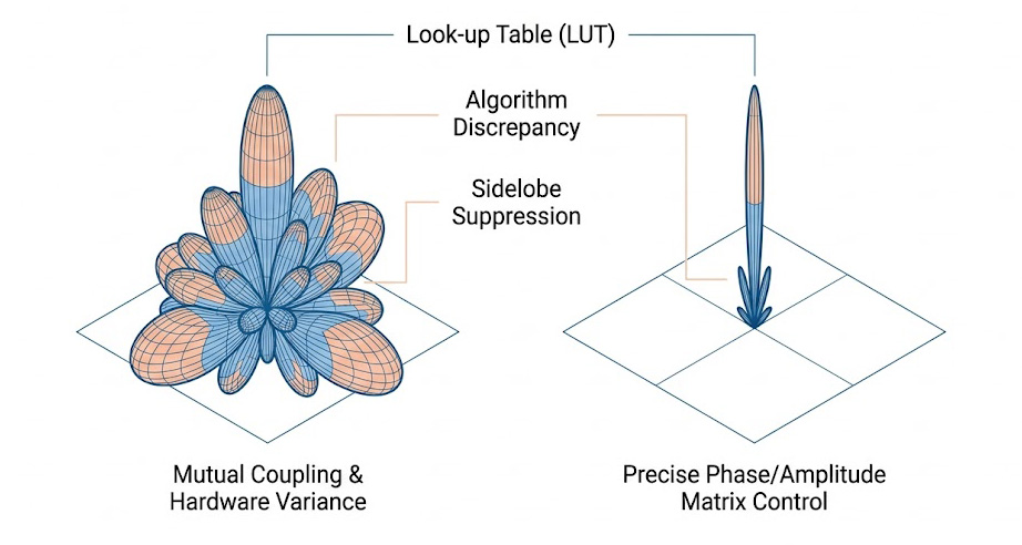 在純粹的數學模擬軟體中,這個過程看似完美,但當演算法落地到真實硬體時,災難便會發生。毫米波頻段的印刷電路板(PCB)走線存在微米級的加工公差;各個射頻主動元件之間存在難以避免的製造變異;更致命的是,密集排列的天線單元之間會產生強烈的電磁互耦合效應(Mutual Coupling)。