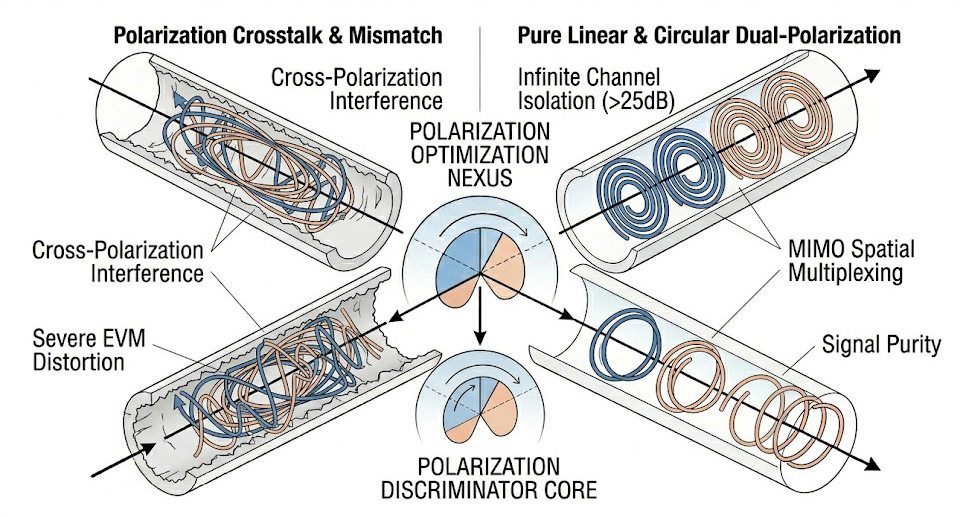 在先進的大規模多輸入多輸出(Massive MIMO)與低軌衛星通訊(LEO SatCom)應用中,為了對抗複雜都會環境的多徑衰落(Multipath Fading)或穿越電離層時的法拉第旋轉效應(Faraday Rotation),系統必須利用「極化空間多工」來倍增頻譜效率,這要求相控陣列必須具備同時發射與接收水平/垂直線性極化,或是右旋/左旋圓極化(RHCP/LHCP)的能力。