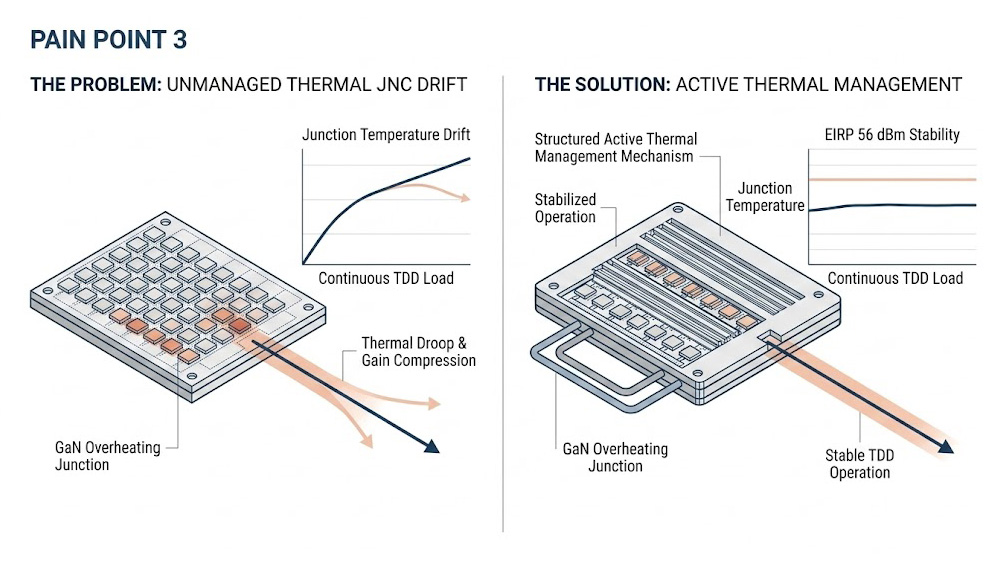 溫度變化對射頻微波元件的性能是致命的,隨著溫度的上升,半導體材料的載子遷移率降低,功率放大器會提早進入飽和區,產生嚴重的增益壓縮(Gain Compression);同時,移相器的插入相位也會發生不可預測的熱漂移(Thermal Droop)。