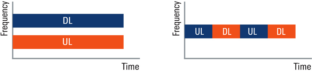 FDD 訊號 (左) 和 TDD 訊號 (右) 的典型配置