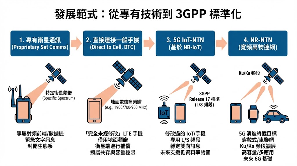 目前的衛星直連技術正處於百家爭鳴的階段,主要可分為兩大陣營與四種發展範式,理解這些範式的物理與協定差異,是進行系統設計與測試的先決條件。