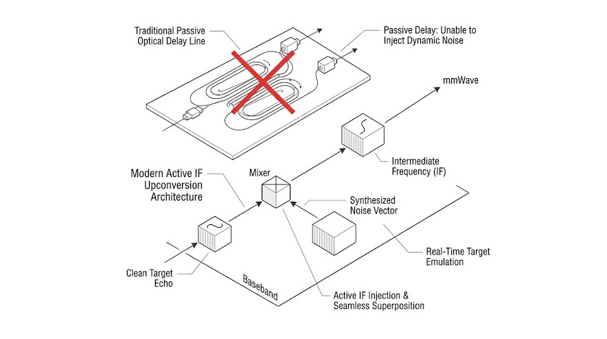 傳統的雷達測試往往依賴光纖延遲線(Fiber Optic Delay Lines),這種被動式架構只能將雷達發射的訊號延遲後原封不動地送回,它無法主動修改訊號特徵,更不可能在微波頻段(79 GHz)將外部的雜訊源完美、無相差地疊加到回波訊號上,如果在 79 GHz的空間中直接使用額外的發射天線來注入干擾,極易因為天線場型的空間耦合不良,導致到達雷達接收天線的干擾功率無法精確量化,失去計量學上的準確度。