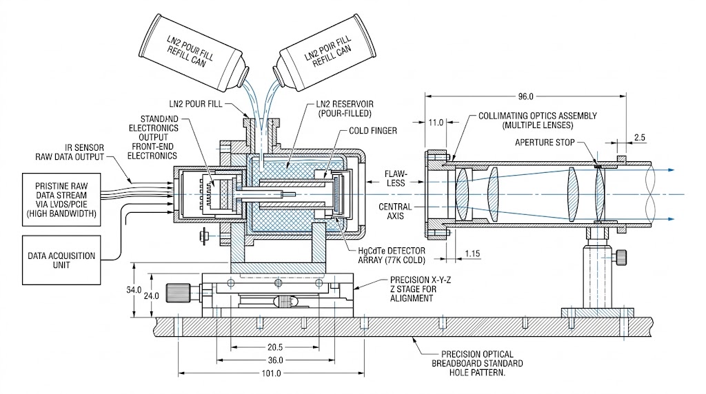 碲鎘汞 (HgCdTe) 光學探測器低溫表徵裝置剖面圖。展示液氮冷卻杜瓦瓶、精密對齊的準直光學組件及資料擷取流程。