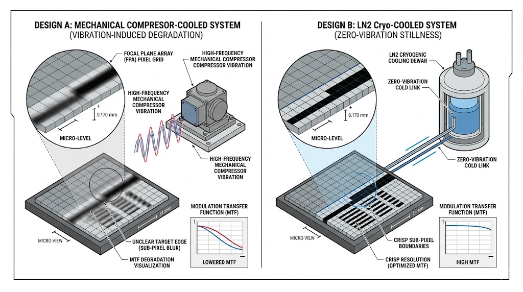 本圖展示兩種冷卻系統對成像解析度的影響。設計 A 機械壓縮機振動引起 FPA 次像素模糊和 MTF 退化,設計 B 液氮深度低溫冷卻杜瓦瓶提供零振動靜止,實現清晰的次像素邊界和優化的高 MTF