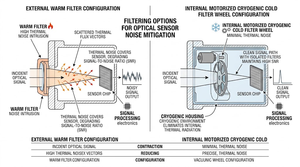 此示意圖對比了兩種光學濾波方案:左側「外部溫熱濾光片」配置顯示外部濾光片引入顯著熱雜訊(由橙色散射向量代表),導致訊號雜訊比(SNR)降低;右側「內部電動低溫冷濾光輪」配置則利用低溫環境消除熱輻射,電動輪可靈活切換不同濾光片,同時維持乾淨訊號路徑與高 SNR