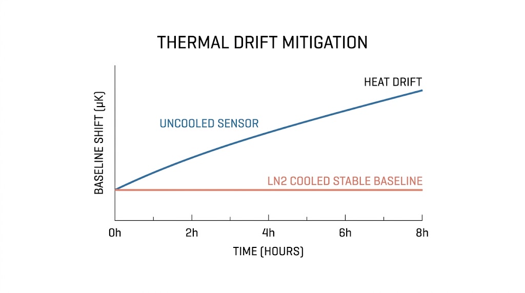 此示意圖比較了有無液氮冷卻的感測器之基線漂移,藍線代表未經冷卻的感測器隨時間推移產生的明顯基線漂移。