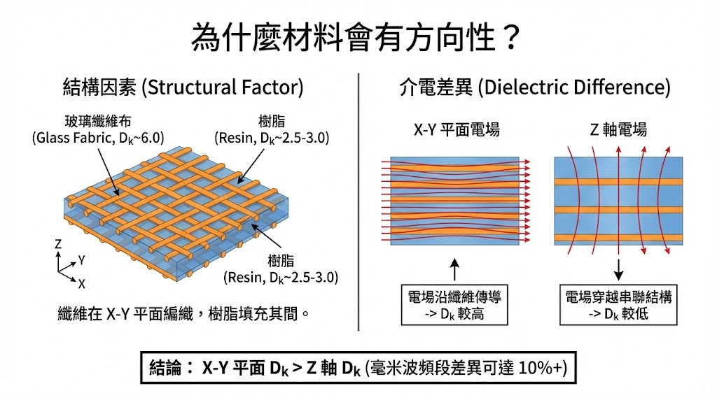 玻璃纖維布是二維編織的網狀結構,主要分佈在 X-Y 平面上,樹脂則填充於纖維之間及層與層之間。 - 介電差異: