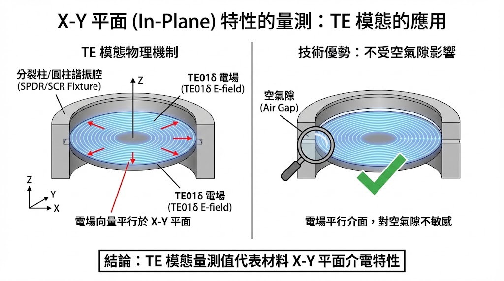 要量測材料在 X-Y 平面的特性,我們通常使用分裂柱介電諧振 (SPDR) 或 分裂圓柱諧振 (SCR) 技術,這類技術的共同物理特徵在於使用了 TE (Transverse Electric) 模態,特別是 TE01δ 模態,在這個模態下,電場向量呈現「同心圓」狀分布於樣品平面上,意即電場方向完全平行於樣品表面 (X-Y 平面),因此這類方法測得的 Dk 與 Df 值,嚴格來說是代表材料在 X-Y 平面 的介電特性。