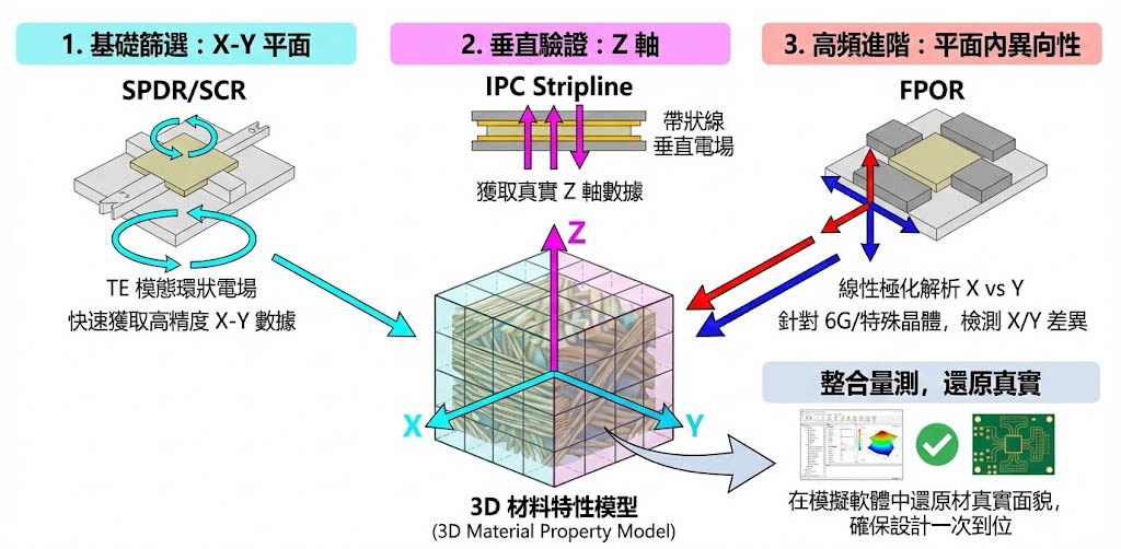經驗豐富的工程師會將同一塊材料分別送入 SPDR (測 X-Y) 與帶狀線治具 (測 Z),比較兩者的 Dk 差異,進而計算出材料的「異向性比率 (Anisotropy Ratio)」,這對於高頻濾波器設計至關重要。