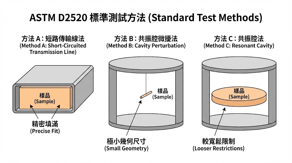 ASTM D2520 是由美國材料和試驗協會 (ASTM) 制定的標準測試方法,全名為「微波頻率及溫度高達 1650°C 下固體電絕緣材料複數介電常數的標準測試方法」,該標準涵蓋了三種不同的測試方法,以適應不同形態的材料: