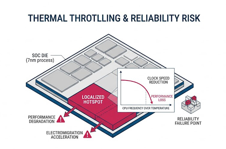 將數十個包含功率放大器(PA)、低雜訊放大器(LNA)與移相器的高頻主動元件高密度封裝,創造了一個微觀的煉獄級熱源,毫米波功率放大器的能源轉換效率通常不高,大部分的直流電能會轉化為廢熱。