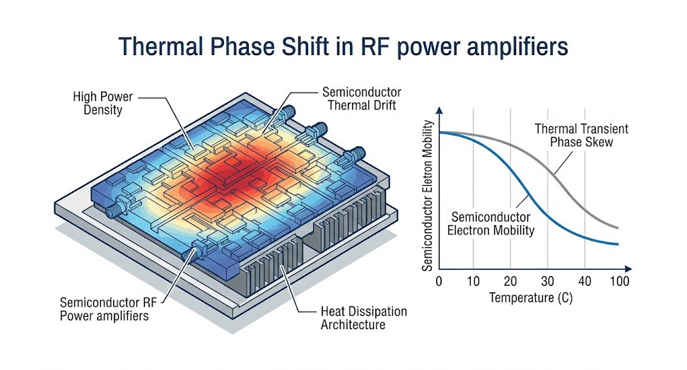 在物理學上半導體材料(如 CMOS 或 SiGe)的電子遷移率對溫度極度敏感,當陣列開始發射連續波或高佔空比的脈衝時,晶片內部的接面溫度(Junction Temperature)會在幾毫秒內急遽攀升,這種劇烈的熱瞬態變化會直接改變元件的傳輸延遲特性,導致射頻訊號產生難以預測的「熱相移(Thermal Phase Shift)」。