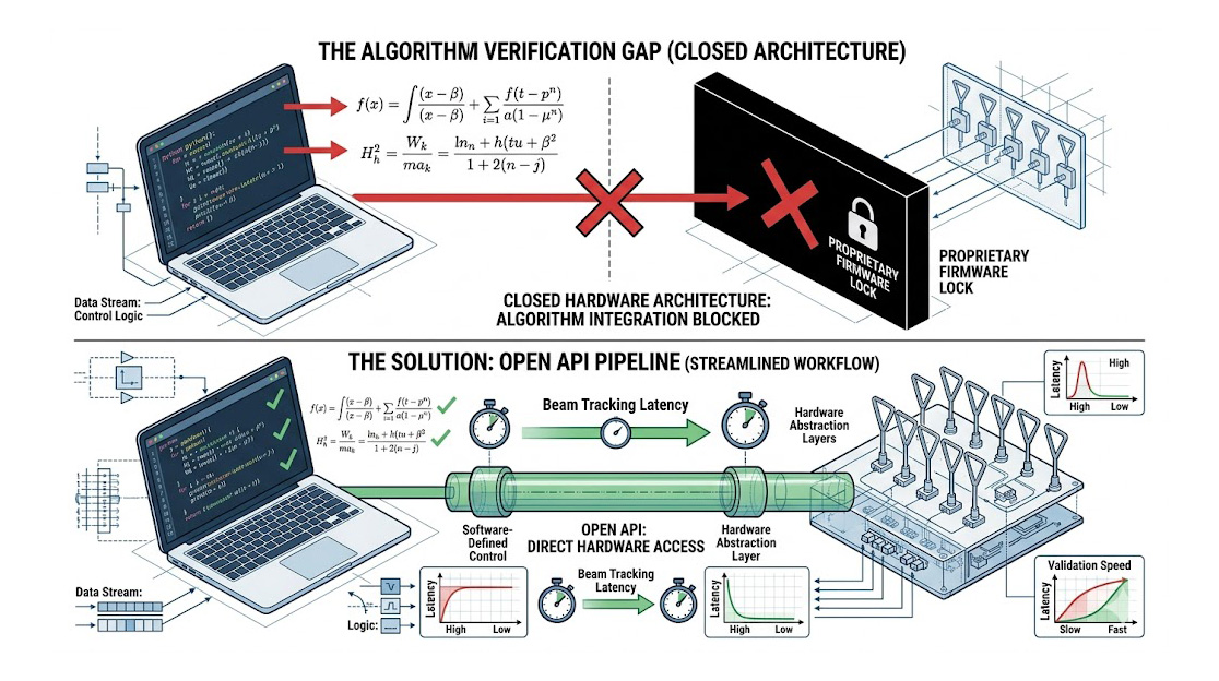 這種「硬體抽象層的阻斷」對研發是一場災難,當演算法工程師開發出全新的自適應波束零陷(Adaptive Nulling)數學模型時,他們需要將這個模型轉換成矩陣,並「即時(Real-time)」寫入到每一個天線單元的移相器中,如果硬體不提供開源的應用程式介面(API),工程師就被迫進行冗長且痛苦的底層暫存器(Register)反向工程,或忍受封閉通訊協定帶來的龐大傳輸延遲(Latency),這使得理論上能在微秒內完成的波束切換,在物理硬體上卻慢了數十毫秒,導致高速移動軌跡(如低軌衛星過境)的動態追蹤驗證徹底失敗。