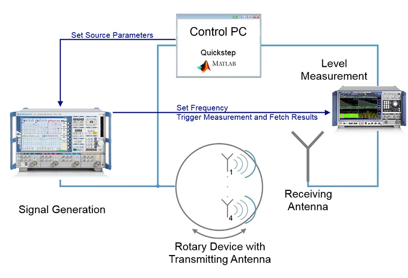 第 2 章說明了一個多單元天線於發射模式(Transmit Mode)下的範例測試架構,本文使用了配套軟體,可使用 R&S® QuickStep 軟體實現天線的快速量測。