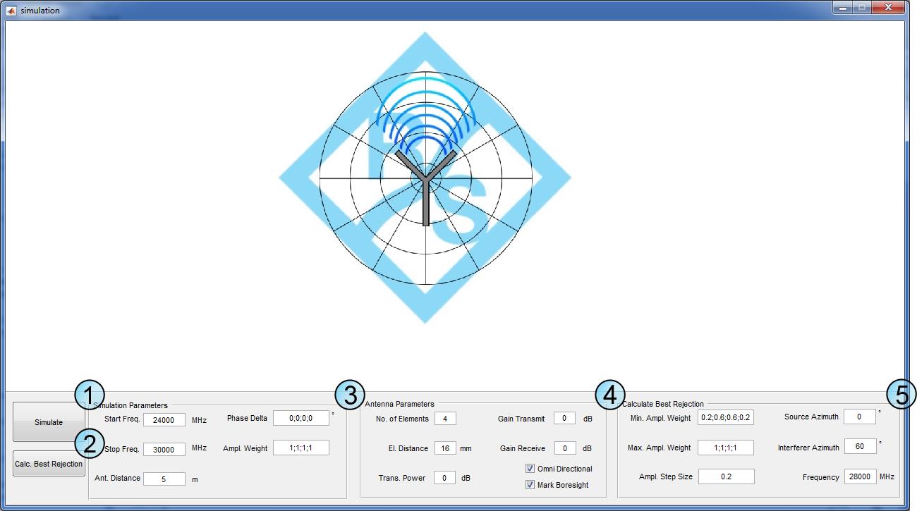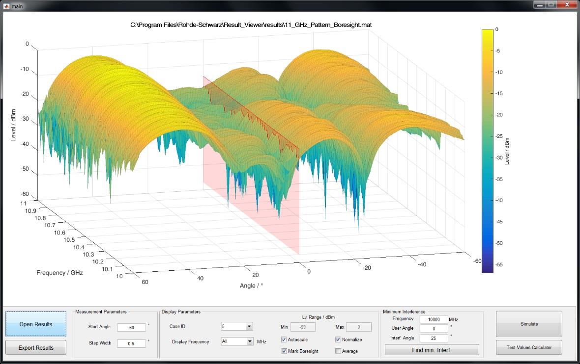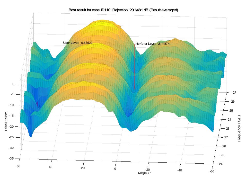 點擊「Find min. Interf.」(尋找最小干擾) 會開啟一個新視窗,顯示在上述設定下被發現能提供最佳結果(即最大抑制)的測試案例,圖 5-2 顯示了一個範例,頻率為 26.4 GHz,使用者角度為 20°,干擾者角度為 -6 度。