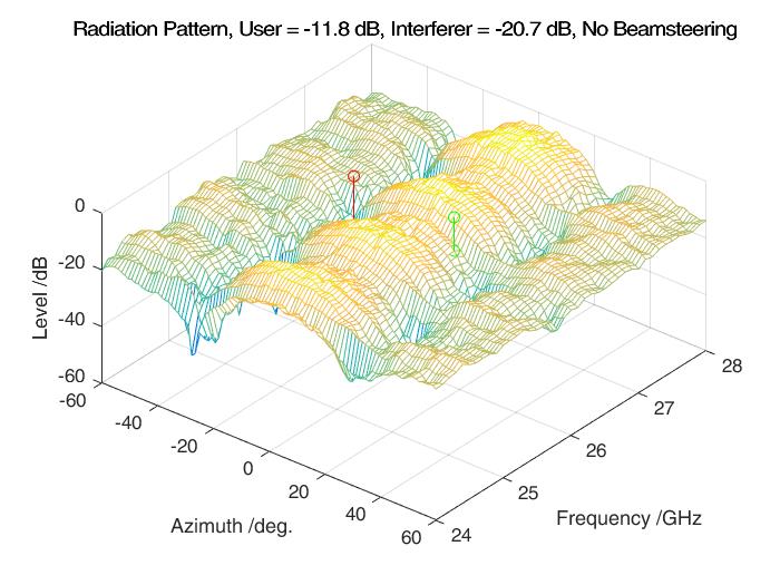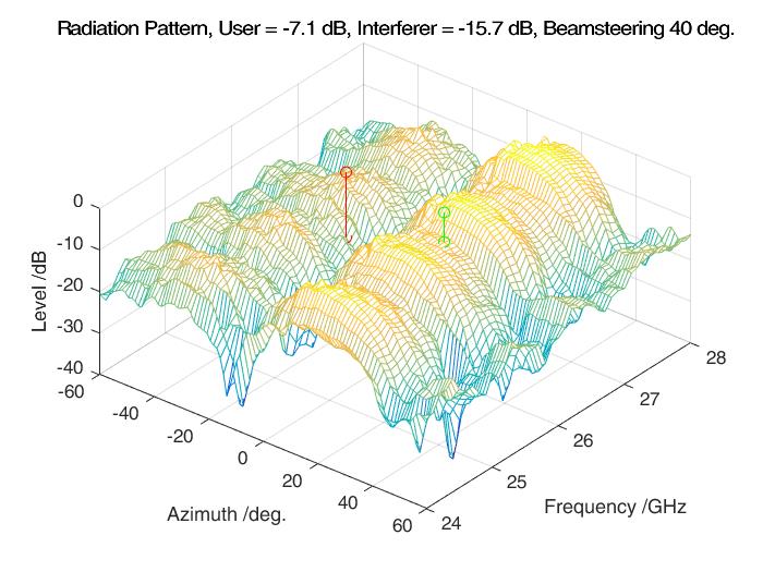 在這種情況下,干擾抑制度提升至 13.5 dB,雖然整體天線輸出功率略有降低,但訊號品質與方向性分辨能力(discrimination capability)明顯改善。