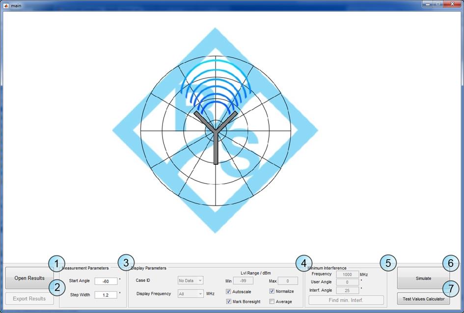 請參閱圖 5-1,底部工具列提供了所有必要的控制項,用於載入和設定量測資料的檢視,以及模擬線性天線陣列,以下內容詳細說明所有控制項的功能: