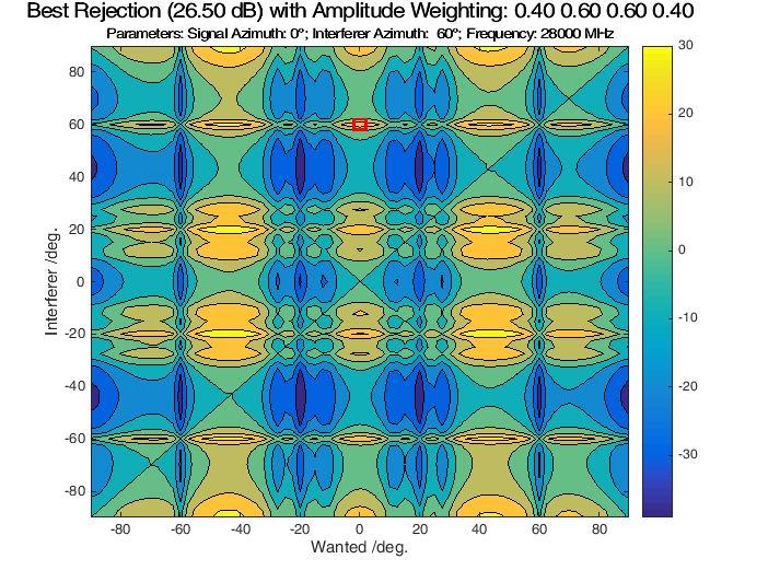 決定干擾訊號的最佳抑制比 (rejection ratio),此計算的參數可在 5 中設定,結果呈現在給定設定下的最佳振幅權重 (amplitude weights),如圖 5-5 所示;在確定每個元件的最佳權重時,所有權重將從最小值掃描 (swept) 到最大值。