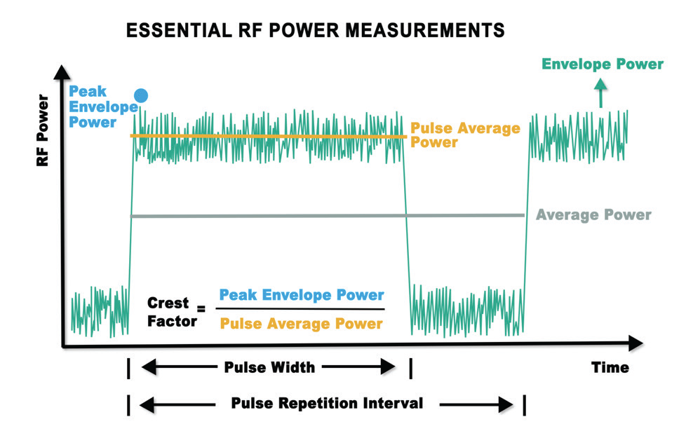 - 平均功率 (Average power):在脈衝重複間隔 (pulse repetition interval, PRI) 內的平均功率位準,此計算包含了訊號叢發以及到下一個脈衝之前的時間間隔。