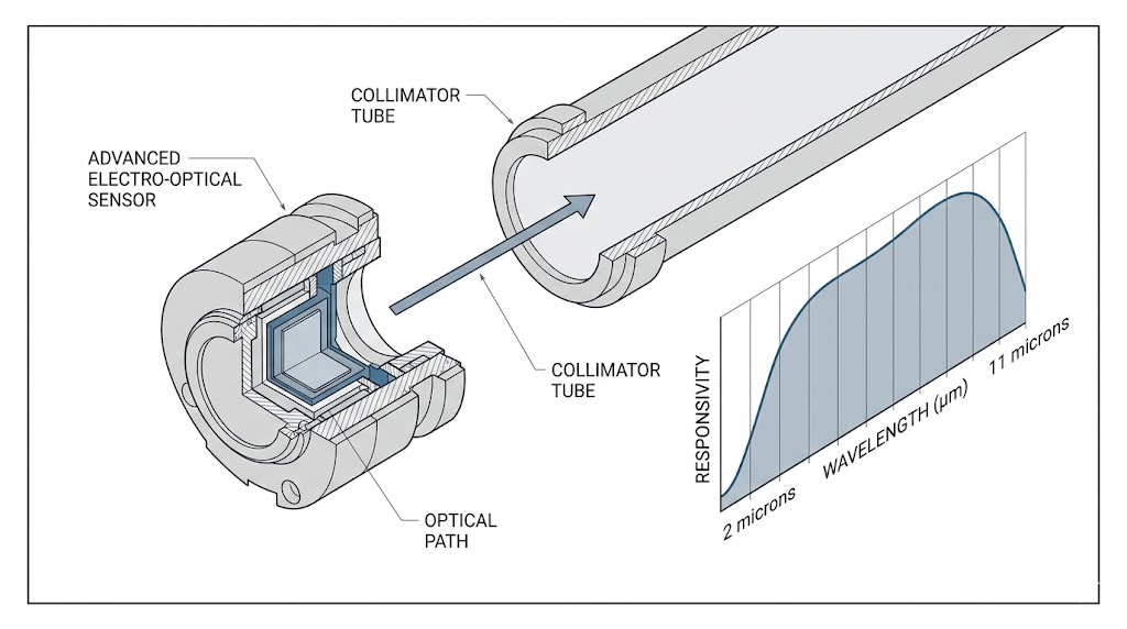 先進光電感測器與準直管剖面示意圖,顯示其光學路徑,右側圖表詳細呈現 2 至 11 微米中長波紅外線響應率。