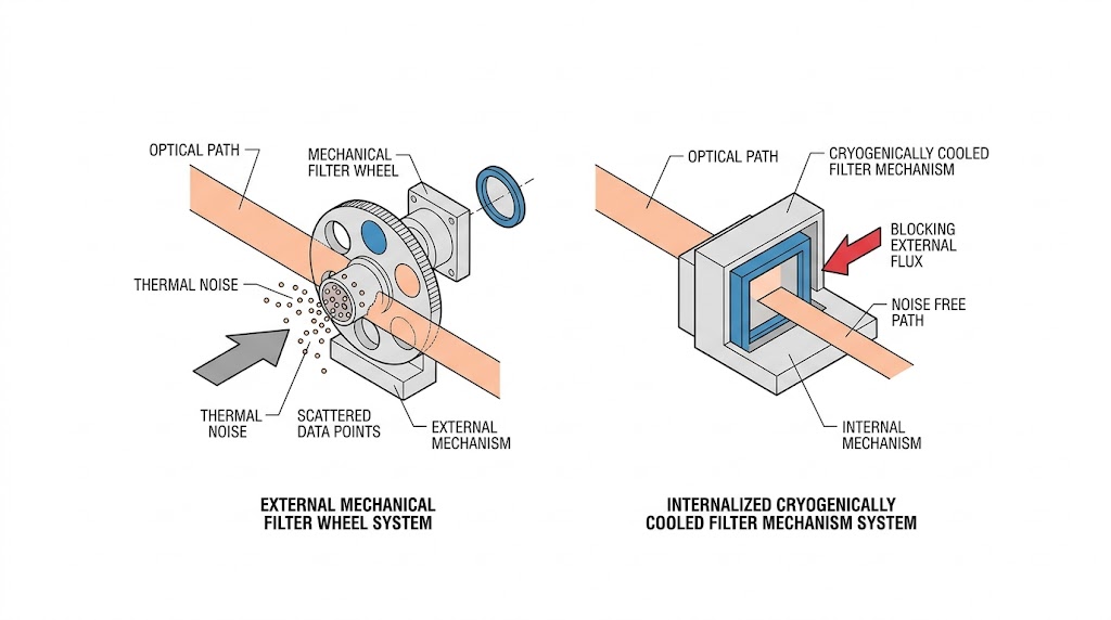 示意圖比較外部機械濾光輪與內建低溫冷卻濾光機制系統,外部濾光輪會產生熱雜訊並散射數據點;內建低溫裝置則能有效阻擋外部通量,提供無雜訊光路,提升高精密光學數據的精確度。