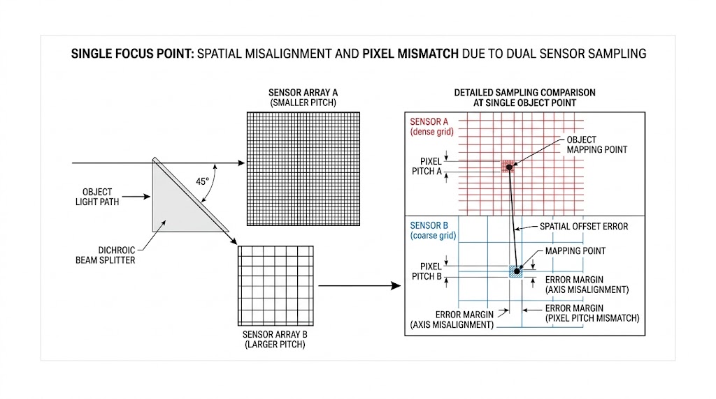 圖中解析二色分光鏡系統中,雙感測器取樣導致單物點空間錯位與像素不匹配,放大比較細/粗像素陣列映射,標示空間偏移與間距不匹配誤差。