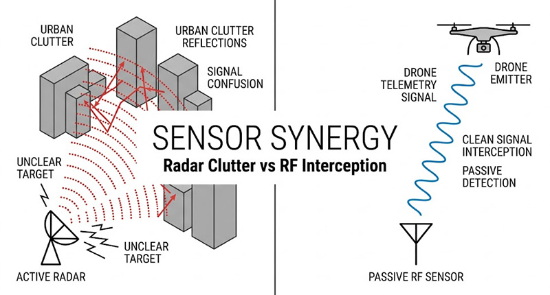 主動式雷達(Active Radar)雖然具備全天候、遠距離偵測優勢,但面對極低雷達截面積(RCS)的微型無人機,在建築密集的城市或工業環境中,極易受到嚴重的地物雜訊(Ground Clutter)與多路徑反射干擾,甚至難以分辨無人機與飛鳥。相對地,被動式射頻監測(Passive RF)能夠在「電磁靜默」下精準捕捉無人機的遙測訊號並鎖定操作員,但若遭遇依賴 GNSS 航路點進行「完全自主飛行(Autonomous Flight)」、全程不發射 RF 訊號的無人機,被動系統將面臨偵測盲區。因此,結合主動與被動感測器的多層次空中盾牌(System-of-Systems),已成為現代 C-UAS 的黃金標準。