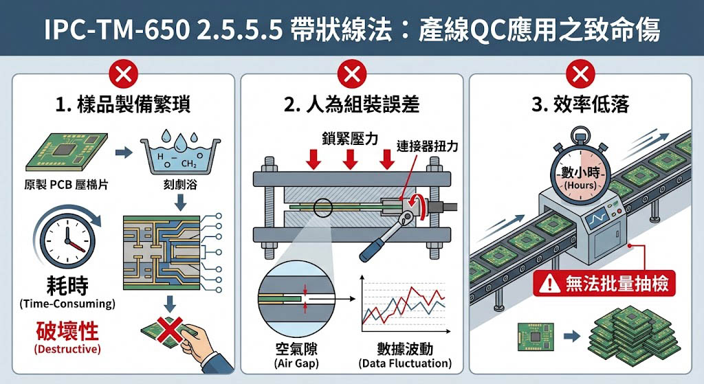 在探討解決方案之前,我們必須先理解問題的本質,在 PCB 與 CCL 產業中,歷史悠久的測試方法如 IPC-TM-650 2.5.5.5 (帶狀線法/Stripline) 雖然能提供 Z 軸方向的數據,對於電路設計極具參考價值,但將其應用於產線出貨檢驗 (QC) 卻存在致命傷: