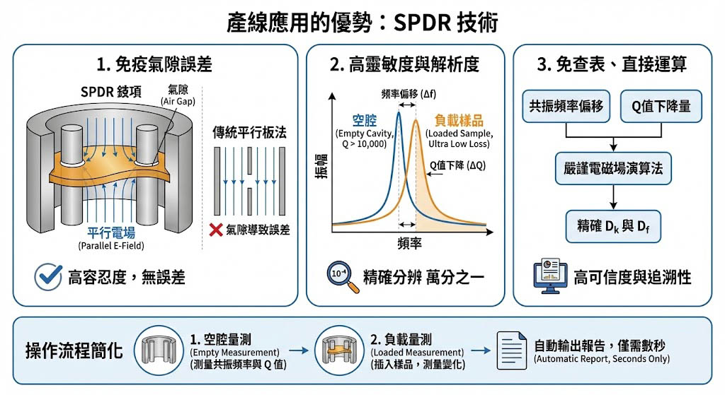 現代化的 SPDR 系統已不再依賴傳統的查表法,透過嚴謹的電磁場演算法,軟體可以直接從共振頻率的偏移量與 Q 值的下降量,精確反算出材料的 Dk 與 Df,大幅提升了數據的可信度與追溯性。