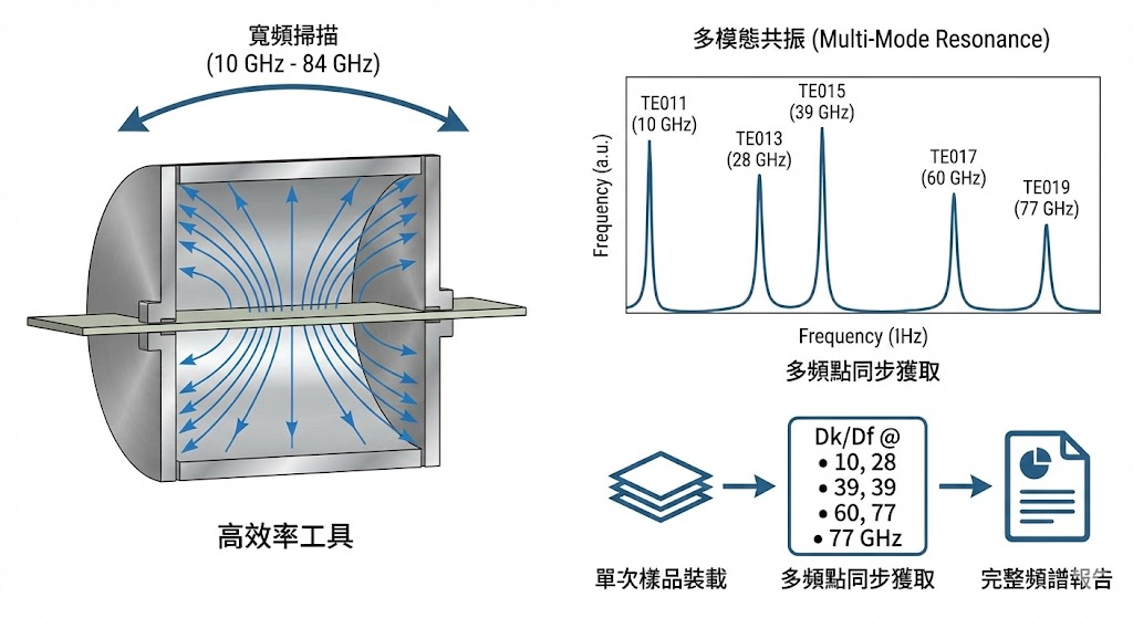 SCR 是一個從中間切開的金屬圓柱腔體,不同於 SPDR 通常是單頻點(如固定在 10GHz),SCR 可以在一個寬廣的頻率範圍內(例如 10 GHz 至 84 GHz)激發出多個共振模態 (TE011, TE013 等),這表示 CCL 廠商使用一套 SCR 治具,即可在一次樣品裝載中,同時獲得 10GHz, 28GHz, 39GHz, 60GHz 甚至 77GHz 等多個頻點的 Dk/Df 數據,這對於需要提供完整頻譜特性報告給客戶的材料商而言,是極具效率的工具。