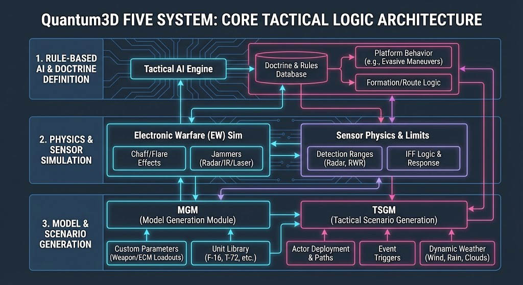 Quantum3D 的 FIVE 系統展示了現代戰術模擬器的核心運作邏輯,主要由以下三個層面構成:
